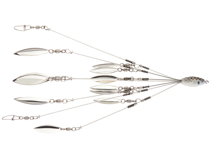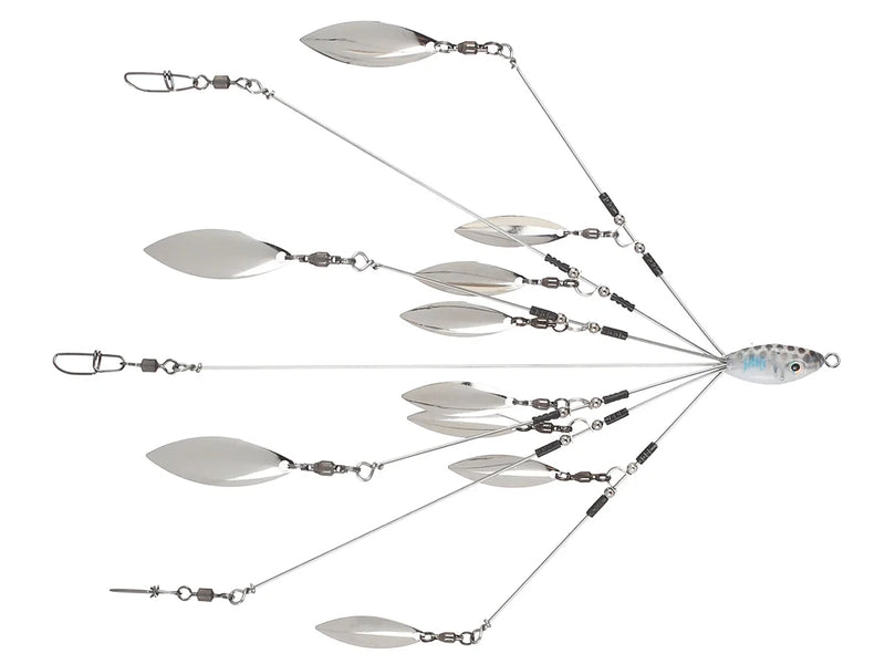 The MOP Rig is a combination of 7 wires and 10 blades with the bulk of the blades on 4 shorter wires. Three longer wires have snaps for swimbaits.
